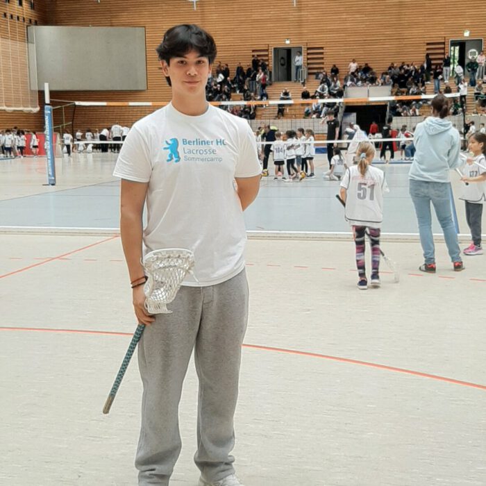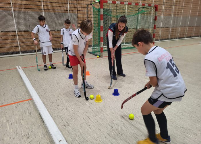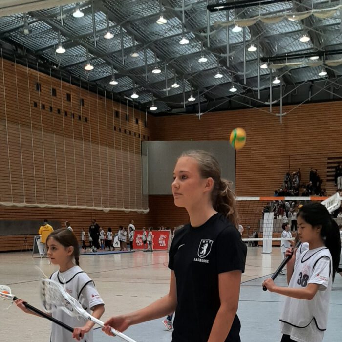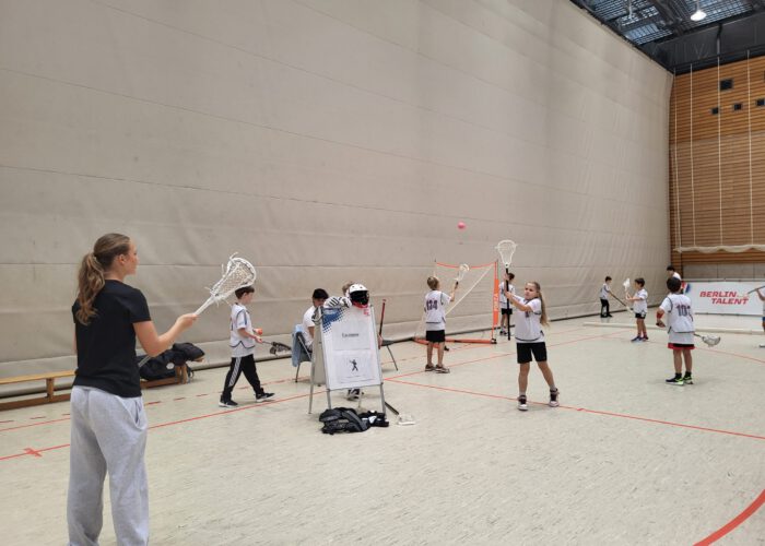 An der Lacrosse-Station lernten die Kinder von der angehenden U‑20 Nationalspielerin Milla Reuter sowie von dem U20 Nationalspieler*innen Julius Busch sowie von Xavier Averdunk wie man mit Lacrosse-Schläger und Ball umgeht.